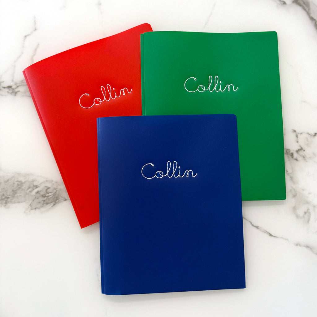 Customize an embroidered pronged 2 pocket plastic folder with your choice of folder color, font style, and thread color. Choose from hundreds of thread colors, just put you color request in the notes section.